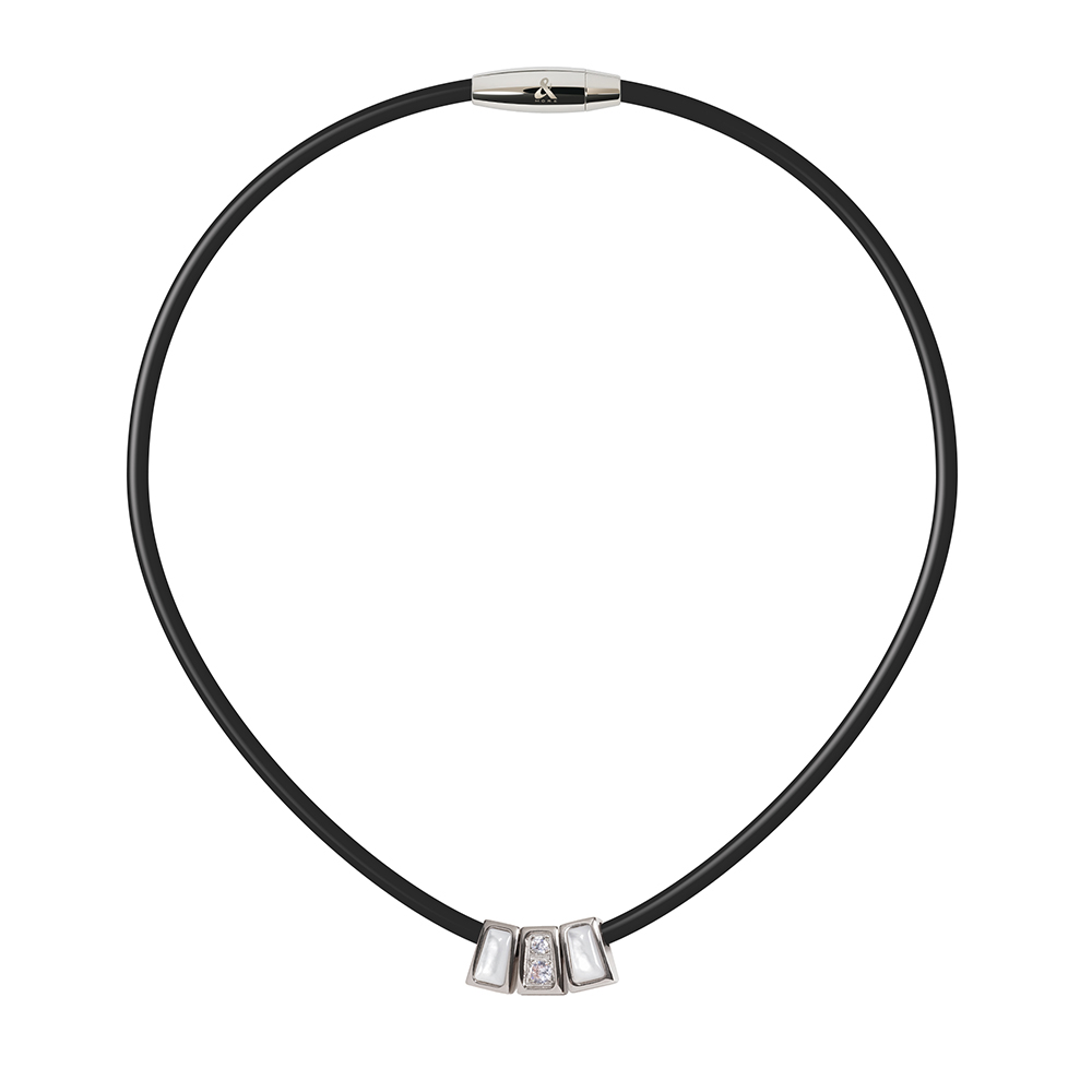 繁星鈦鍺項鍊結合天然母貝與閃耀晶鑽,完美演繹星空的神秘與光輝,結合能量與健康概念。細膩的母貝光澤與閃爍的晶亮鑽石交織出獨特的質感,白鋼打造降低過敏發生疑慮,打造出層次豐富且充滿現代感的設計。