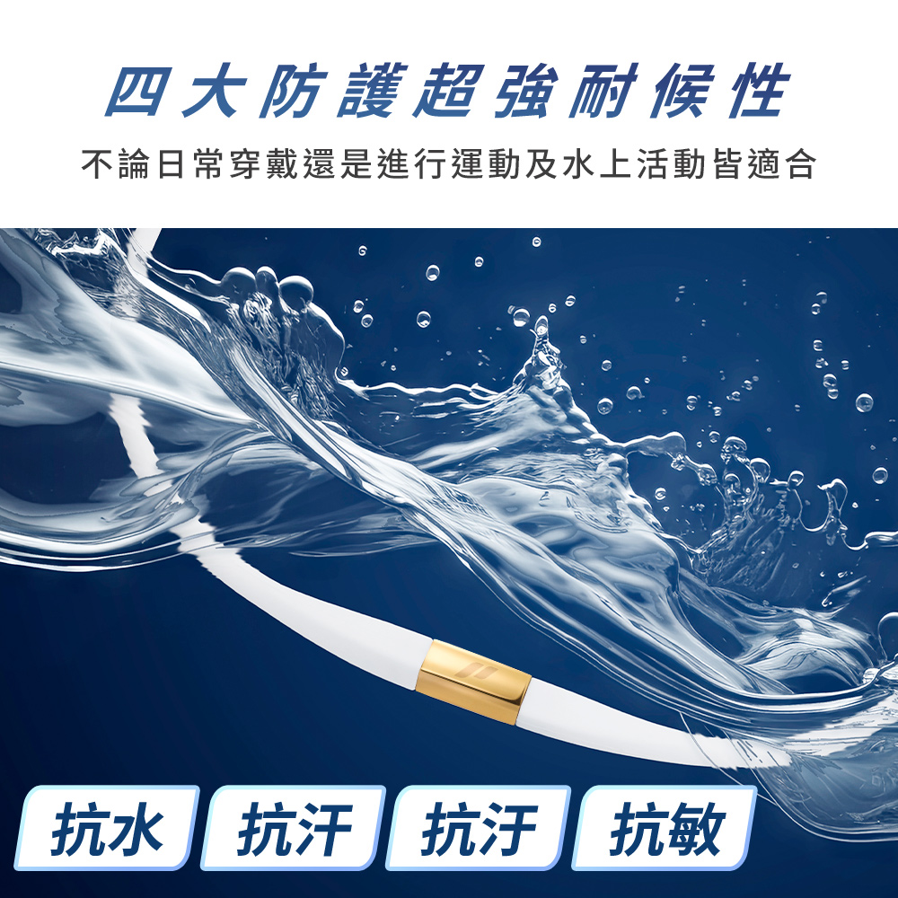鍊身使用高彈性優質矽膠材質,具備優異的抗水、抗汗、抗汙與抗敏效果,即使長時間配戴或在運動、洗澡、游泳等環境中使用,也能維持穩定品質。搭配316L不鏽鋼卡扣設計,堅固耐用不易鬆脫,耐磨抗鏽,質感與功能兼具。