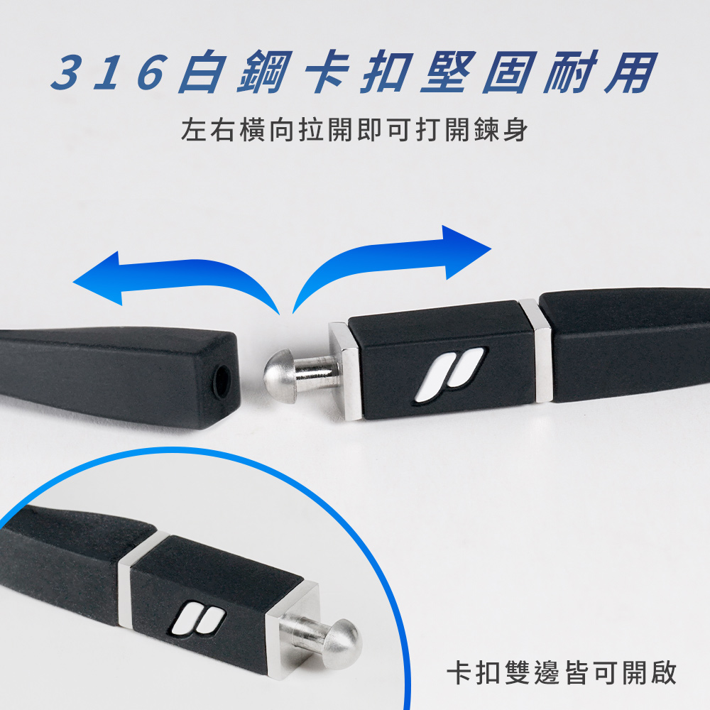 鍊身使用高彈性優質矽膠材質,具備優異的抗水、抗汗、抗汙與抗敏效果,即使長時間配戴或在運動、洗澡、游泳等環境中使用,也能維持穩定品質。搭配316L不鏽鋼卡扣設計,堅固耐用不易鬆脫,耐磨抗鏽,質感與功能兼具。