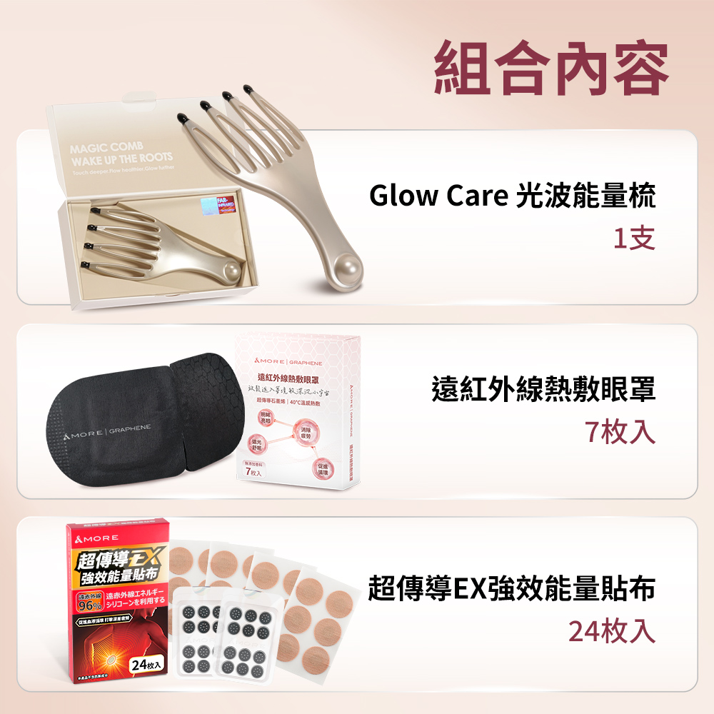 商品組合:光波能量梳、眼罩7入、能量貼布24枚