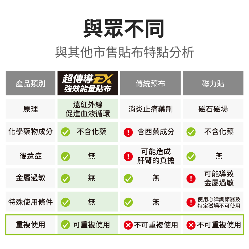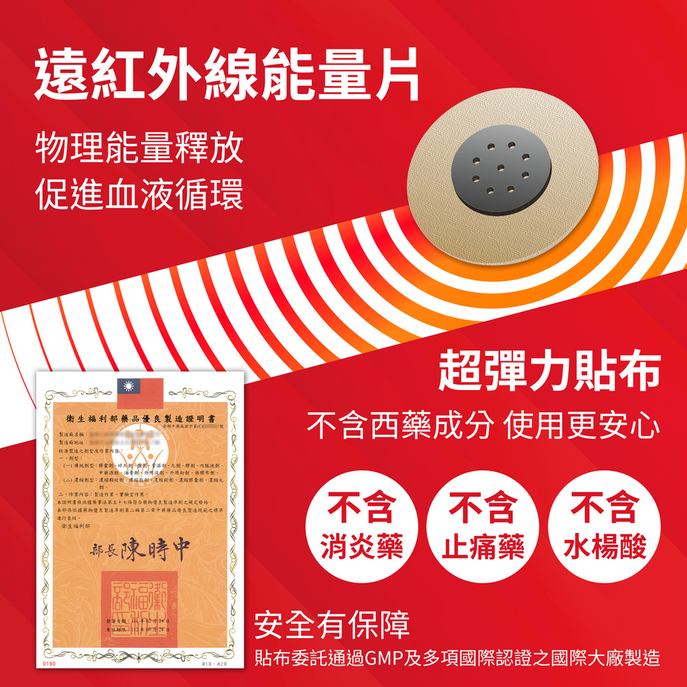 能量貼布成份:遠紅外線能量矽膠片(遠紅外線能量矽膠)、高彈力貼布(薄荷精油、辣椒精油、樹脂、基布、離型紙)