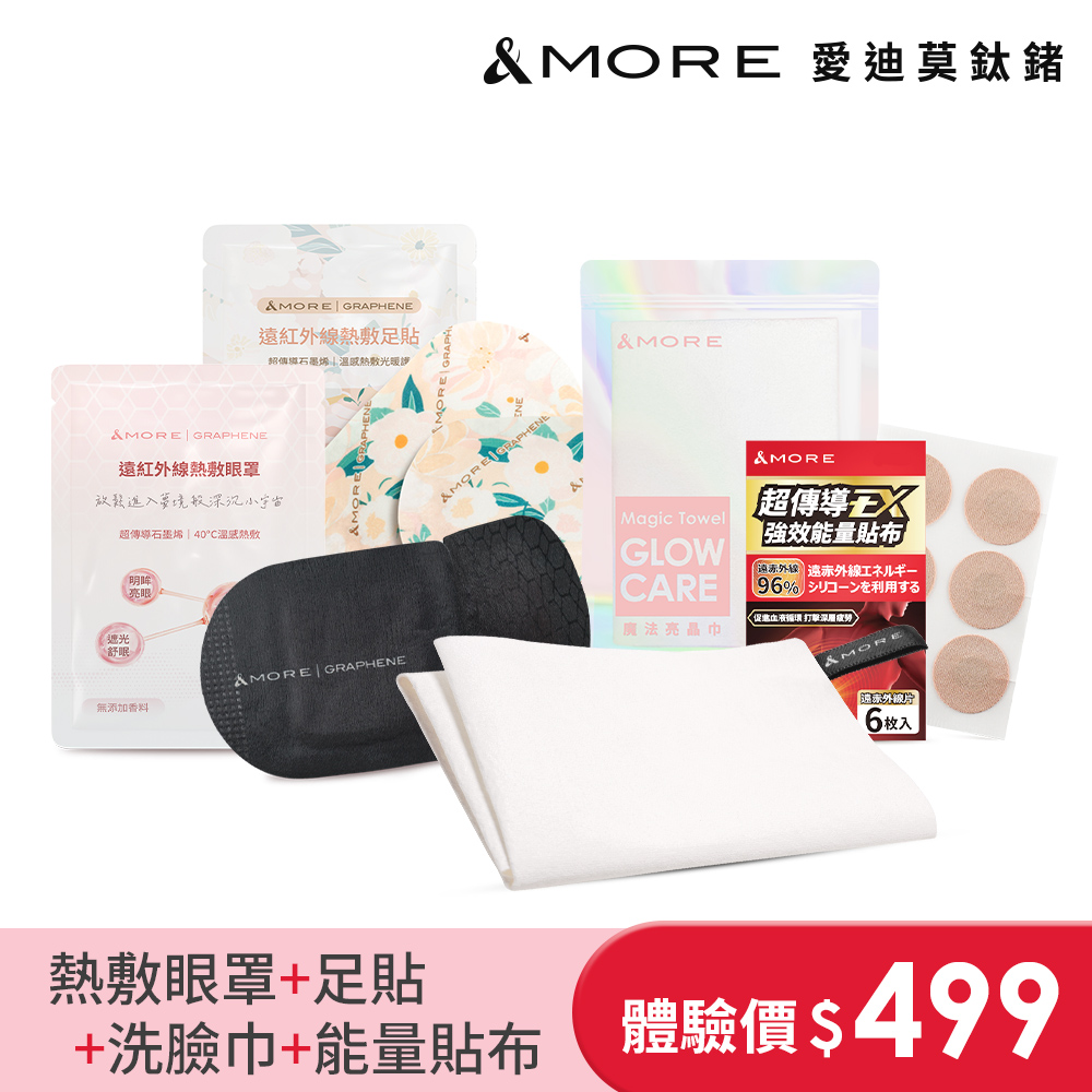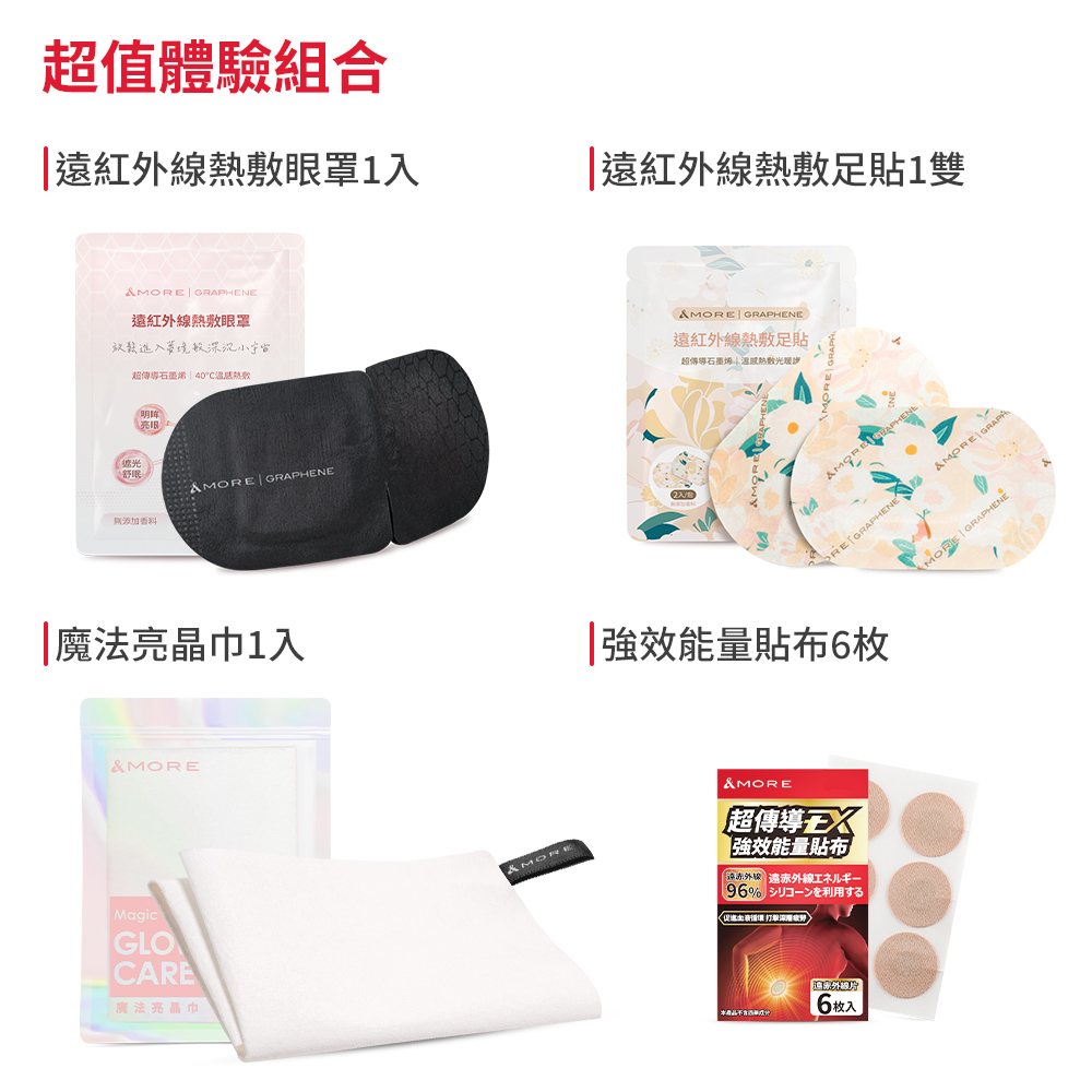 商品組合:Glow Care魔法亮晶巾(洗臉巾)x1、遠紅外線熱敷眼罩x1、遠紅外線熱敷足貼x1、超傳導EX強效能量貼布(遠紅外線能量矽膠片6枚、高彈力貼布6枚)