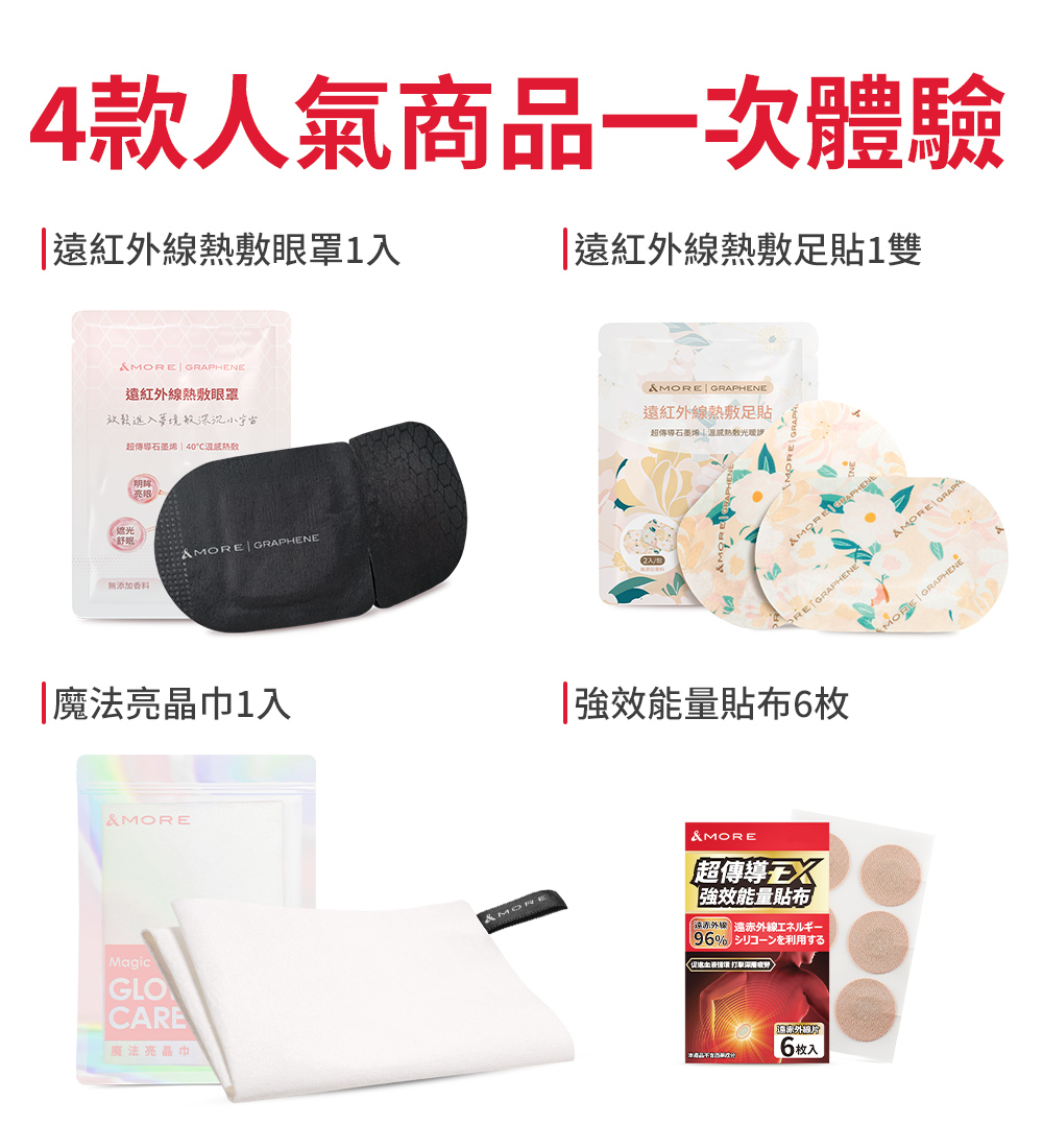 商品組合:Glow Care魔法亮晶巾(洗臉巾)x1、遠紅外線熱敷眼罩x1、遠紅外線熱敷足貼x1、超傳導EX強效能量貼布(遠紅外線能量矽膠片6枚、高彈力貼布6枚)