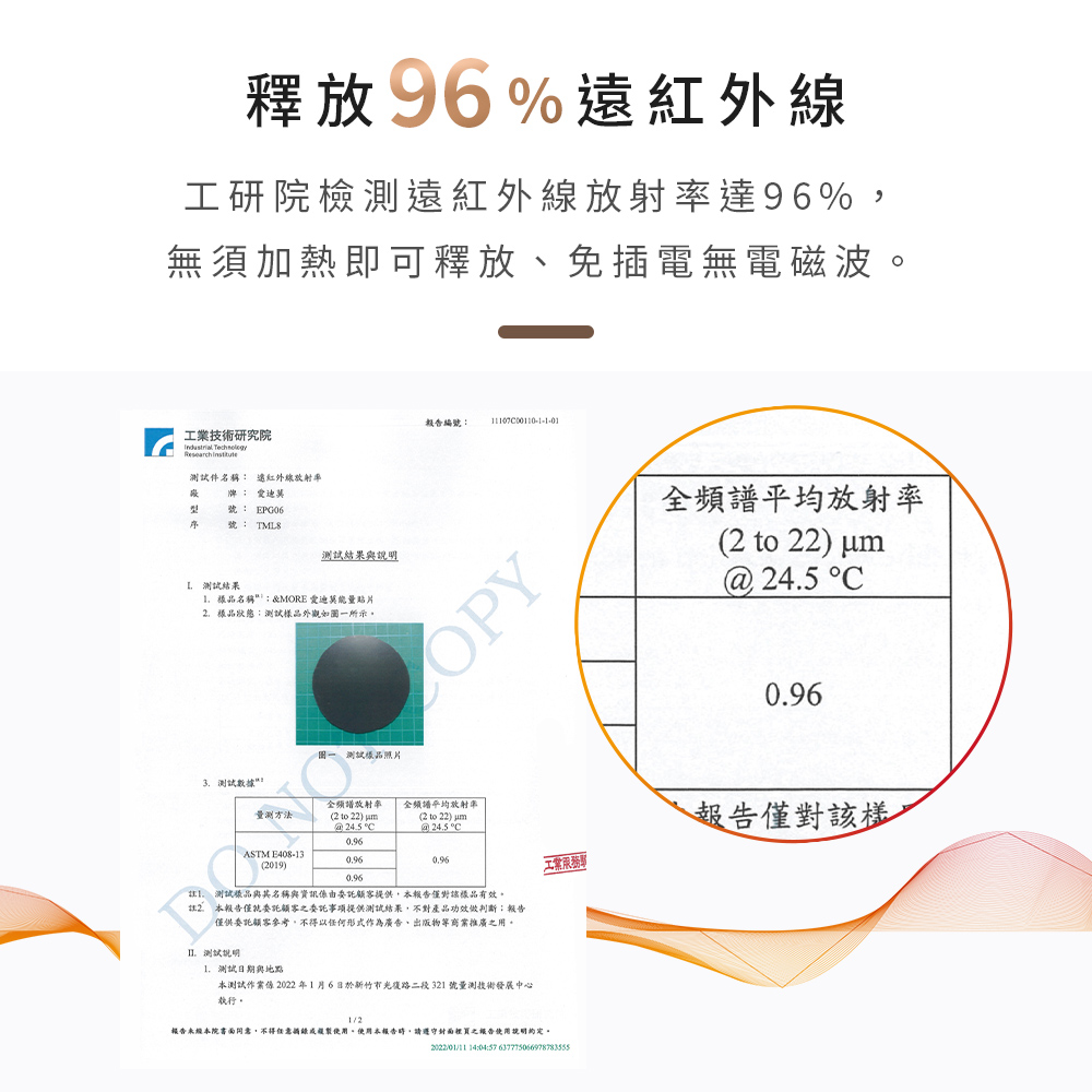 商品送SGS檢測、工研院檢測,遠紅外線釋放率高達96%,無需插電、無電磁波,即可長效釋放能量,傳導迅速。